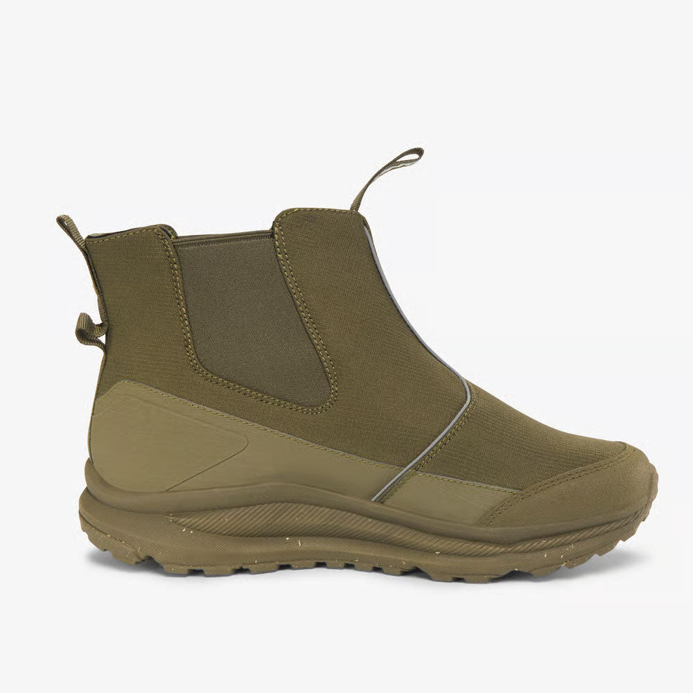 リップストップ素材のアッパーに防水メンブレンを組み合わせ、雨の日も安心。つま先とかかとには補強を入れ、丈夫さを高めています。内側には柔らかなフリースライニングを採用し、足を心地よく包み込みながら保温性を確保。リサイクルEVAのミッドソールは軽くてクッション性があり、歩きやすさをサポートします。暗い場所での視認性を高めるリフレクターも装備。伸縮性のあるサイドゴアで脱ぎ履きしやすく、快適なフィット感を実現。ソールはかかとからつま先へスムーズに体重移動できるカーブ設計で、ラバーアウトソールは深い溝により高いグリップ力と柔軟性を発揮します。